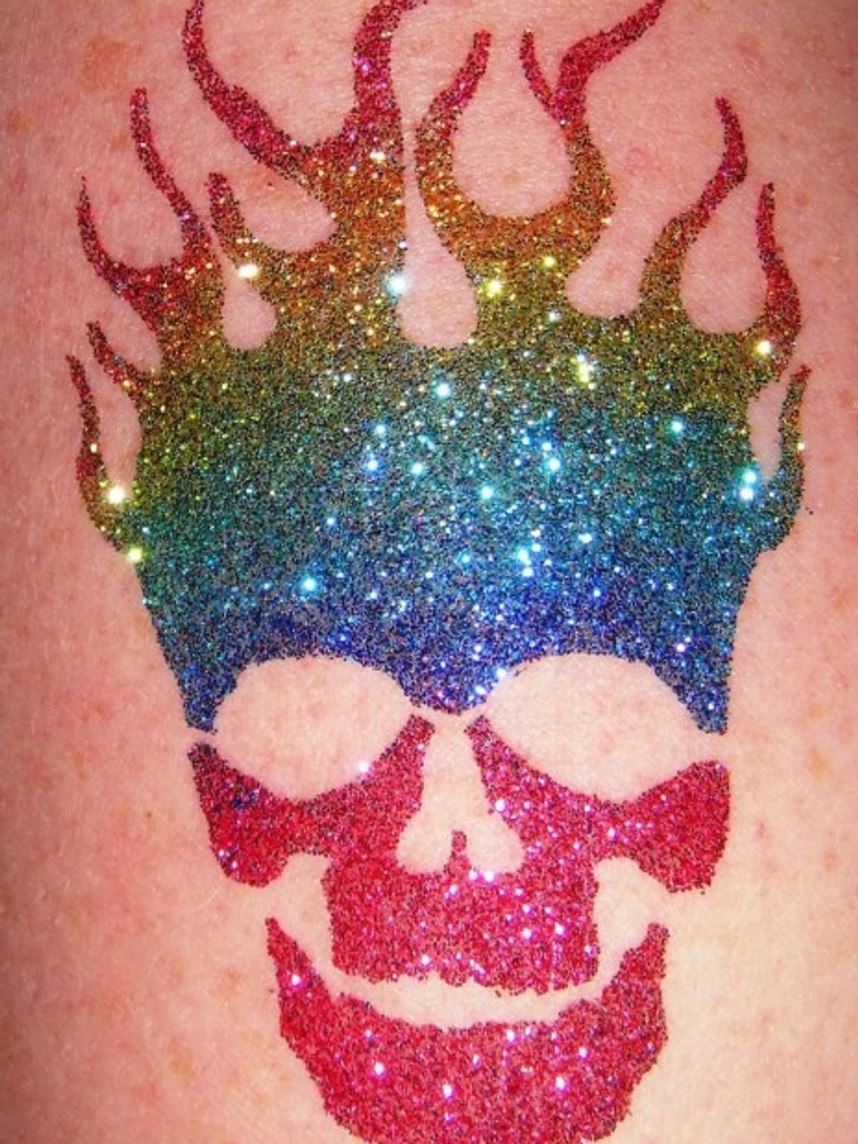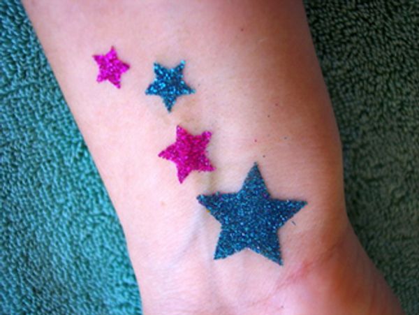 How is it done? First, the skin is cleansed with alcohol, then an adhesive stencil is placed directly onto the skin to make the design in cosmetic adhesive. With your choice of glitter color, these tattoos will remain waterproof, sweat-proof, and sparkling for about a week! This is effective on any skin tone.